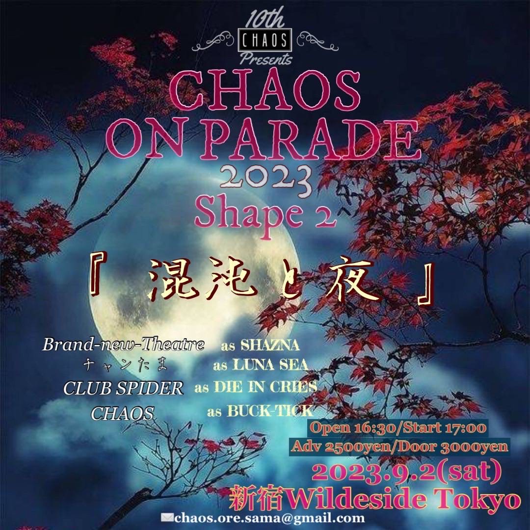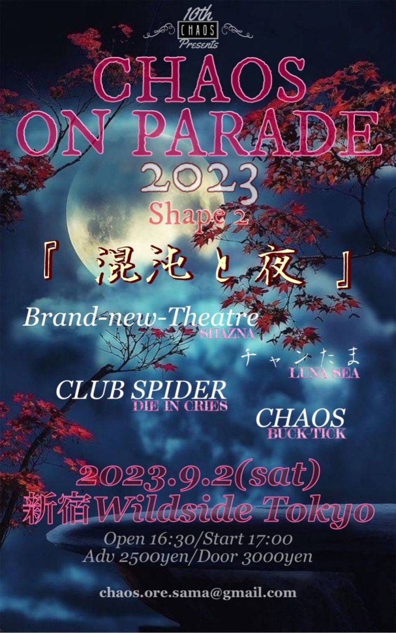 出演者 CHAOS CLUB SPIDER チャンたま Brand-new-Theatre OPEN 16:30 / START 17:00 ADV ¥2,500 / DOOR ¥3,000
