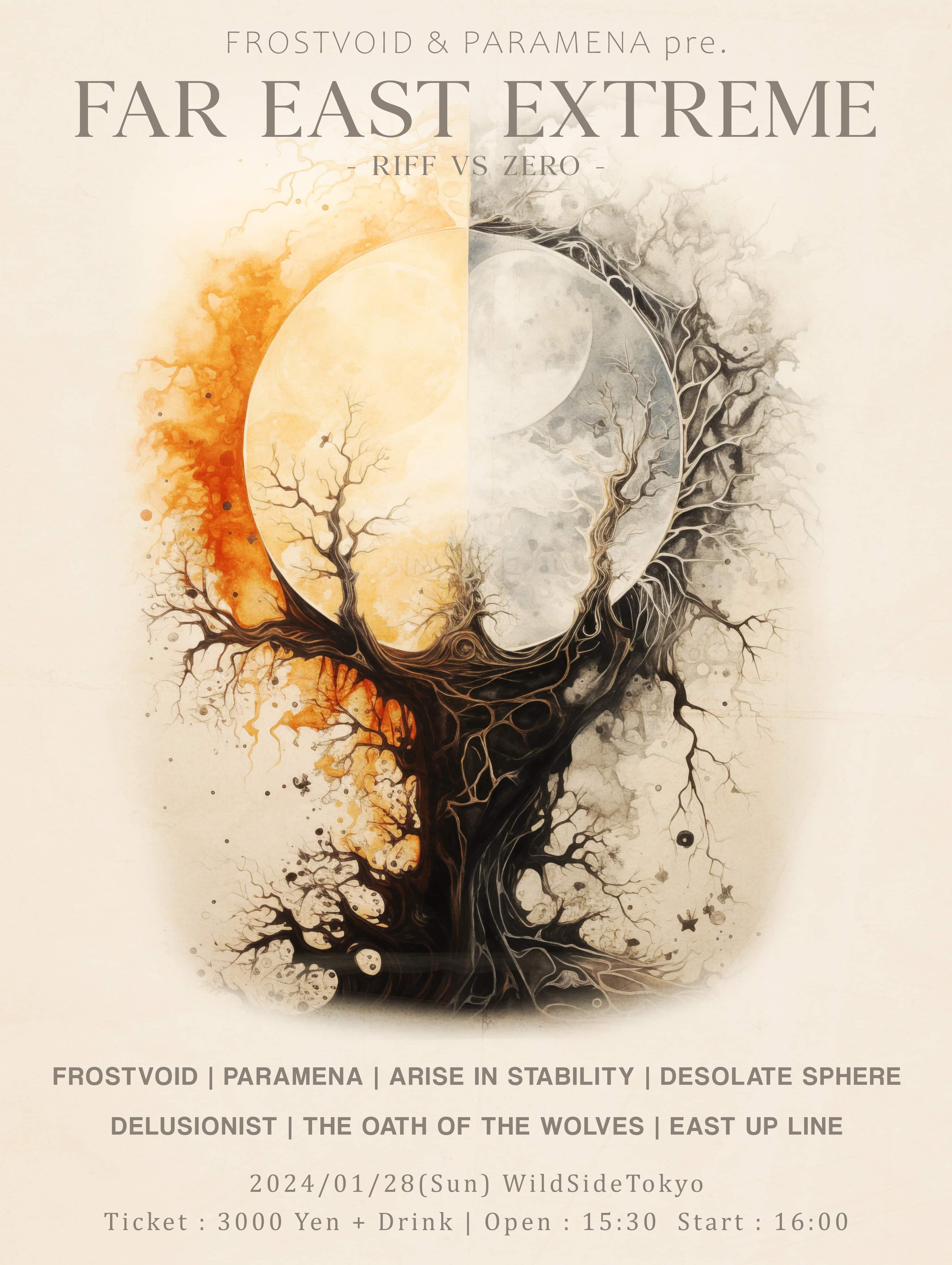 出演者 Frostvoid PARAMENA Arise In Stability Desolate Sphere Delusionist The Oath Of The Wolves East Up Line OPEN 15:30 / START 16:00 TICKET ¥3,000 (1DRINK別)