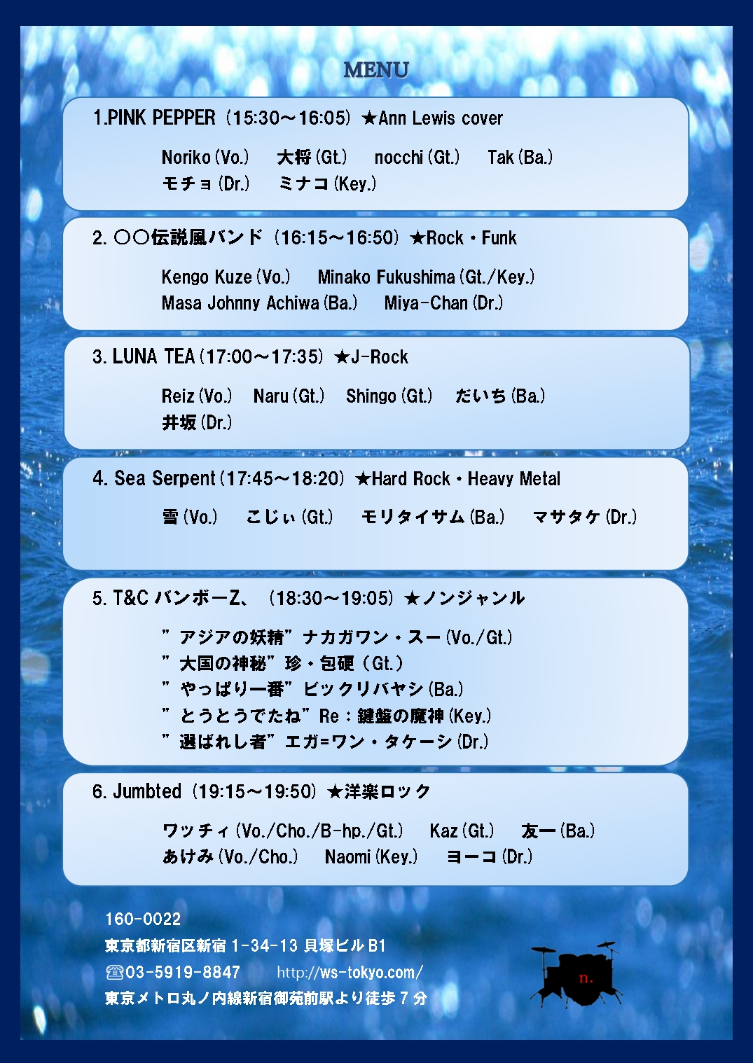 出演者 PINK PEPPER 〇〇伝説風バンド LUNA TEA Sea Serpent T&CバンボーZ、 Jumbted OPEN 15:00 / START 15:30 CHARGE¥1.200(1DRINK CHARGE込み)