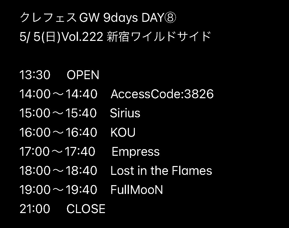 出演者 Lost in the Flames FullMooN Empress Sirius KOU AccessCode:3826 OPEN 13:30 / START 14:00 ADV ¥3,500 / DOOR ¥4,000 (1DRINK別)