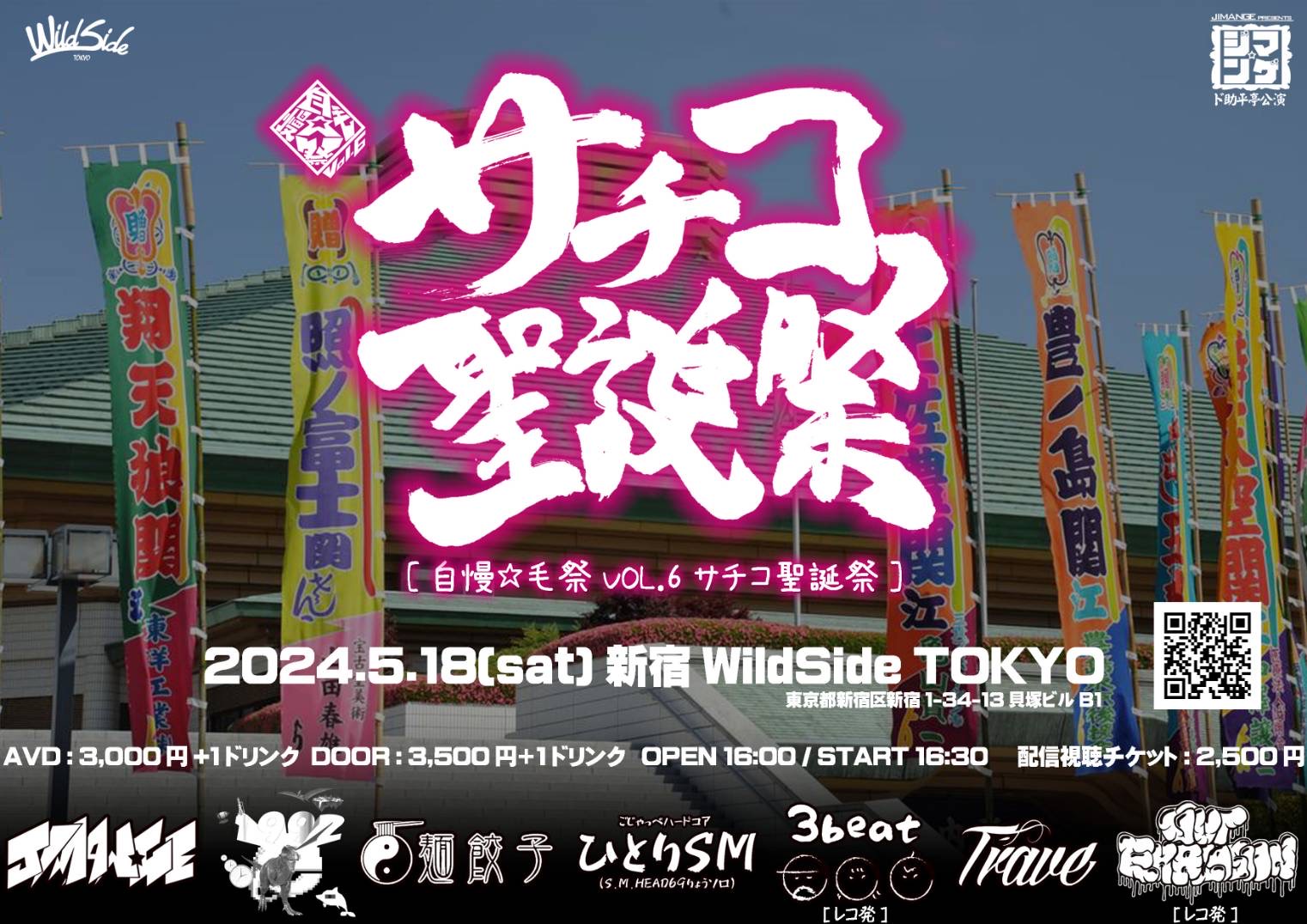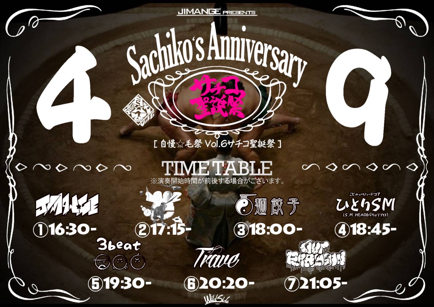 出演者 自慢☆毛 1992 麺餃子 ひとりSM(S.M HEAD69) 3beat TRAVE Gut Explosion FOOD: サチコの生足(生ハム) 肉丸屋(唐揚げ) OPEN 16:00 / START 16:30 ADV ¥3,000 / DOOR ¥3,500 (1DRINK別) / 配信 ¥2,500