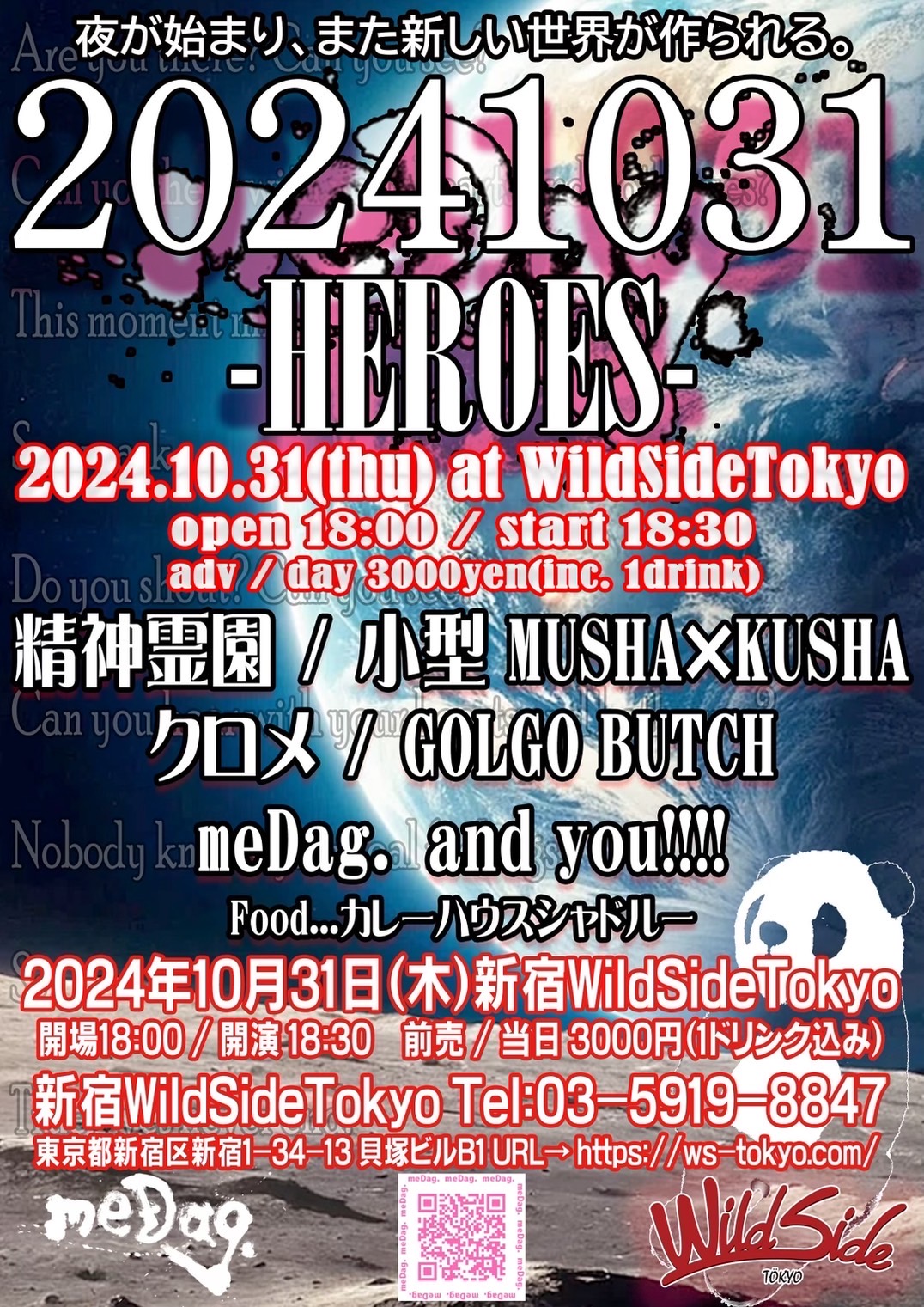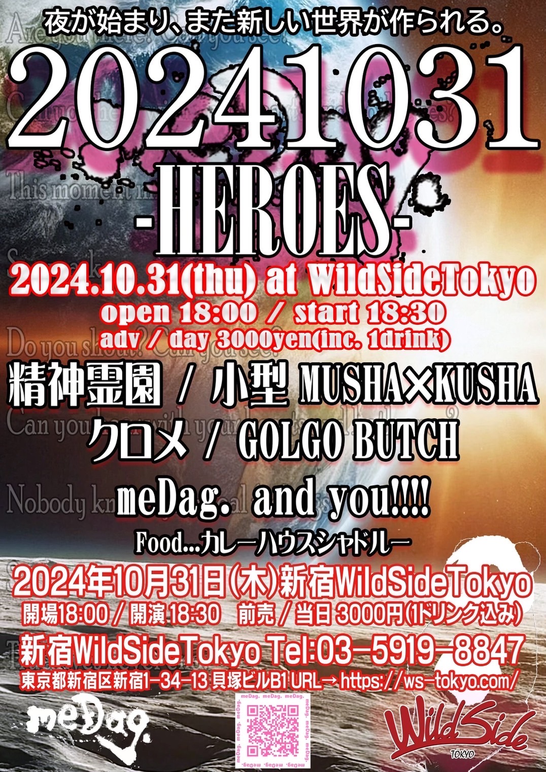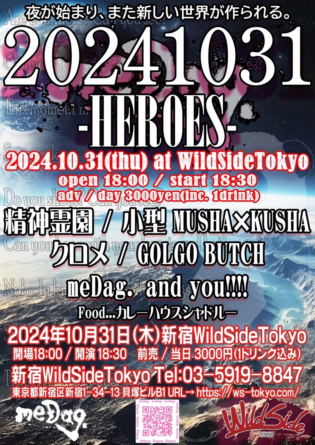出演者 meDag. GOLGOBUTCH クロメ 小型MUSHAxKUSHA 精神霊園 OPEN 18:00 / START 18:30 CHARGE ¥3,000 (1DRINK付き)