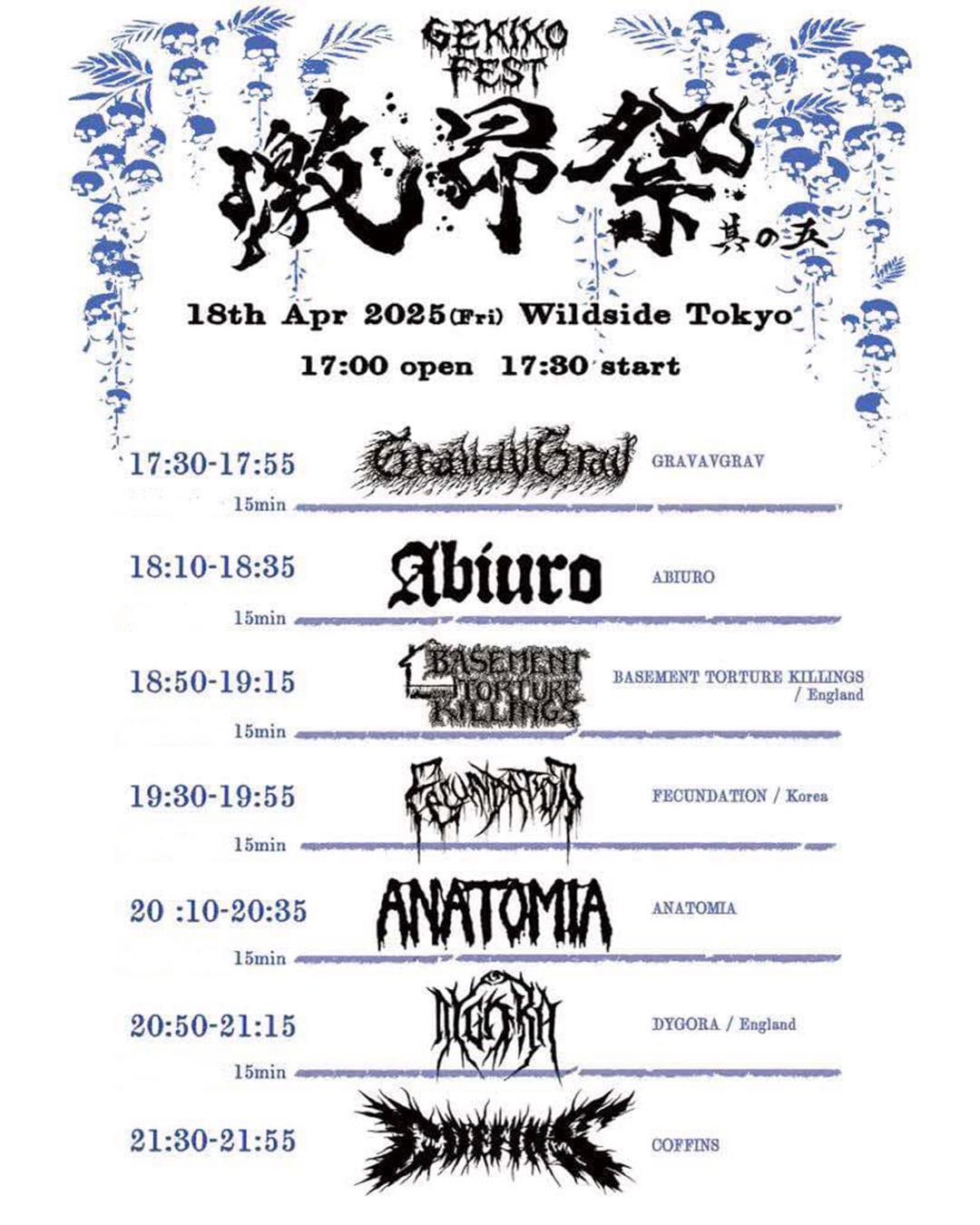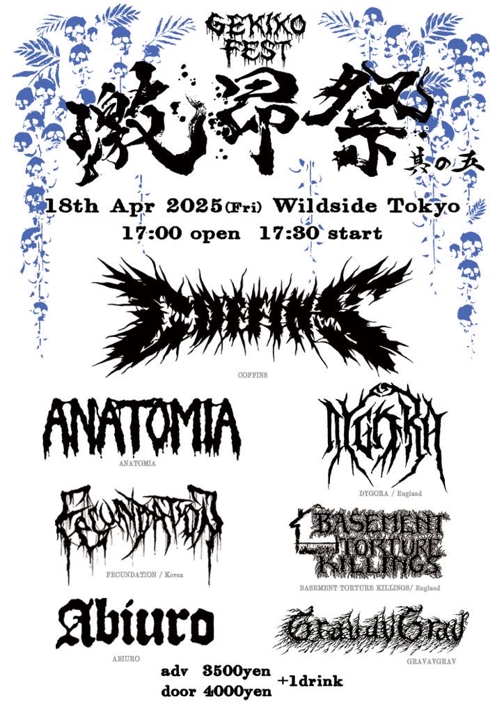 出演者 ABIURO BASEMENT TORTURE KILLINGS FECUNDATION ANATOMIA DYGORA COFFINS GRAVAVGRAV OPEN 17:00 / START 17:30 ADV ¥3,500 / DOOR ¥4,000 (1DRINK別)
