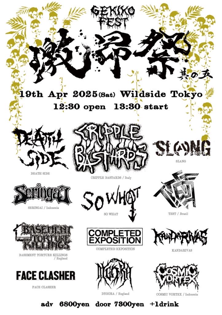 出演者 BASEMENT TORTURE KILLINGS DYGORA FACE CLASHER SERINGAI SO WHAT COMPLETED EXPOSITION SLANG DEATH SIDE CRIPPLE BASTARDS TEST KANDARIVAS MORTIFY OPEN 12:30 / START 13:30 ADV ¥6,800 / DOOR ¥7,800 (1DRINK別)