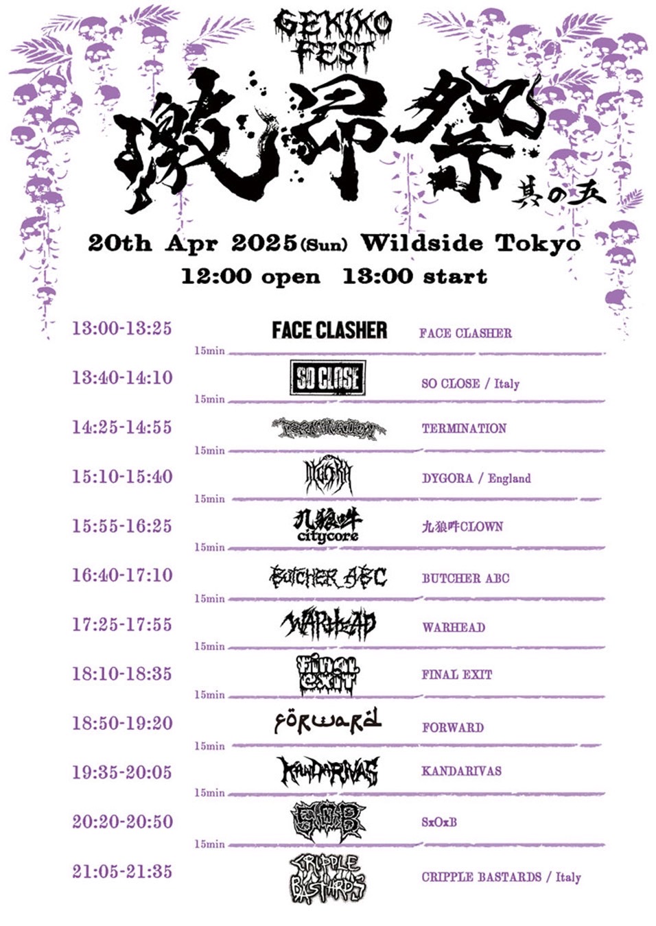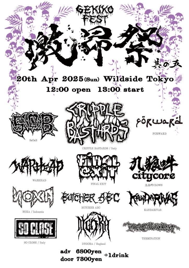 出演者 BUTCHER ABC TERMINATION SO CLOSE FINAL EXIT DYGORA 九狼吽CLOWN FACE CLASHER WARHEAD KANDARIVAS FORWARD SxOxB CRIPPLE BASTARDS OPEN 12:00 / START 13:00 ADV ¥6,800 / DOOR ¥7,800 (1DRINK別)