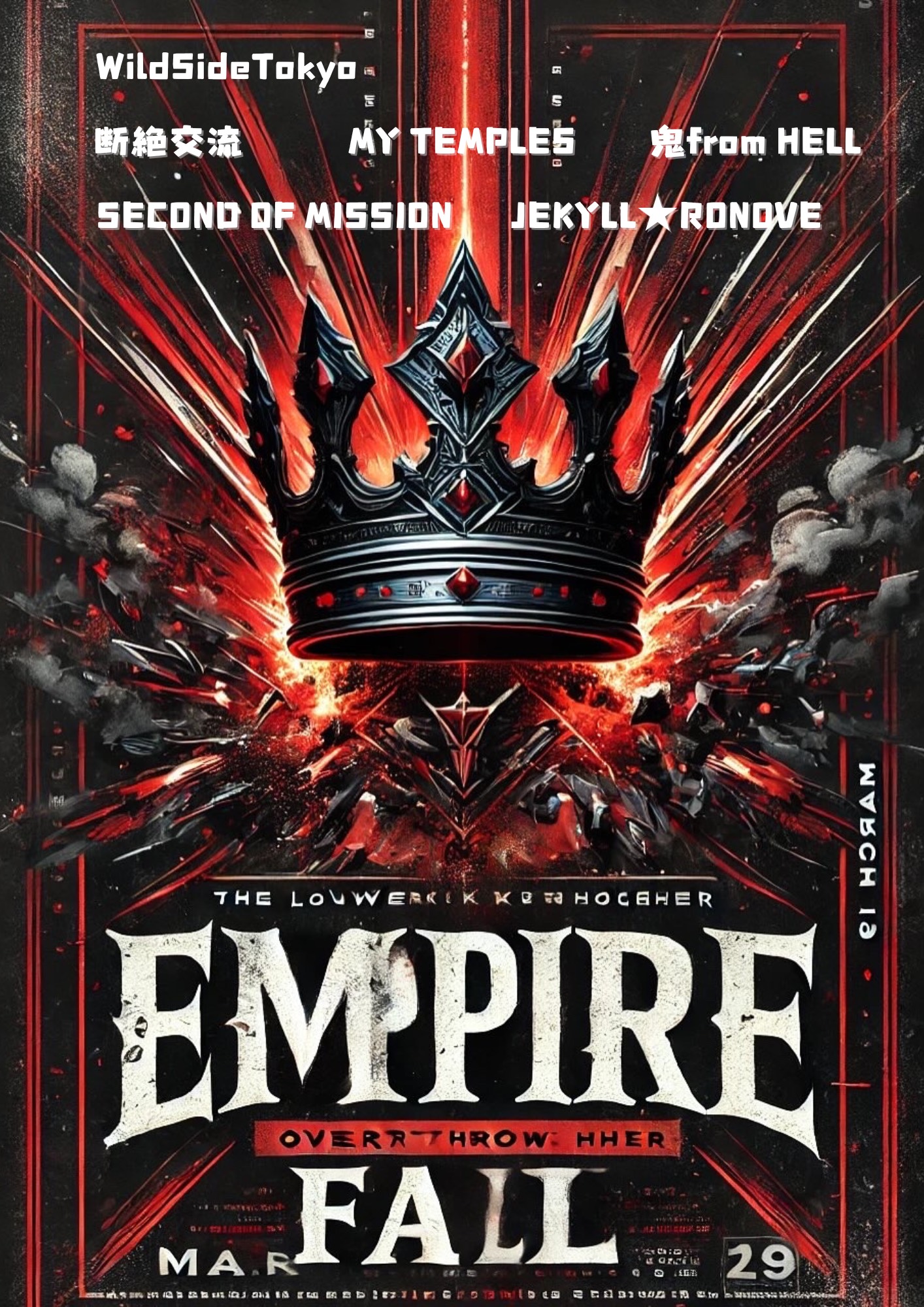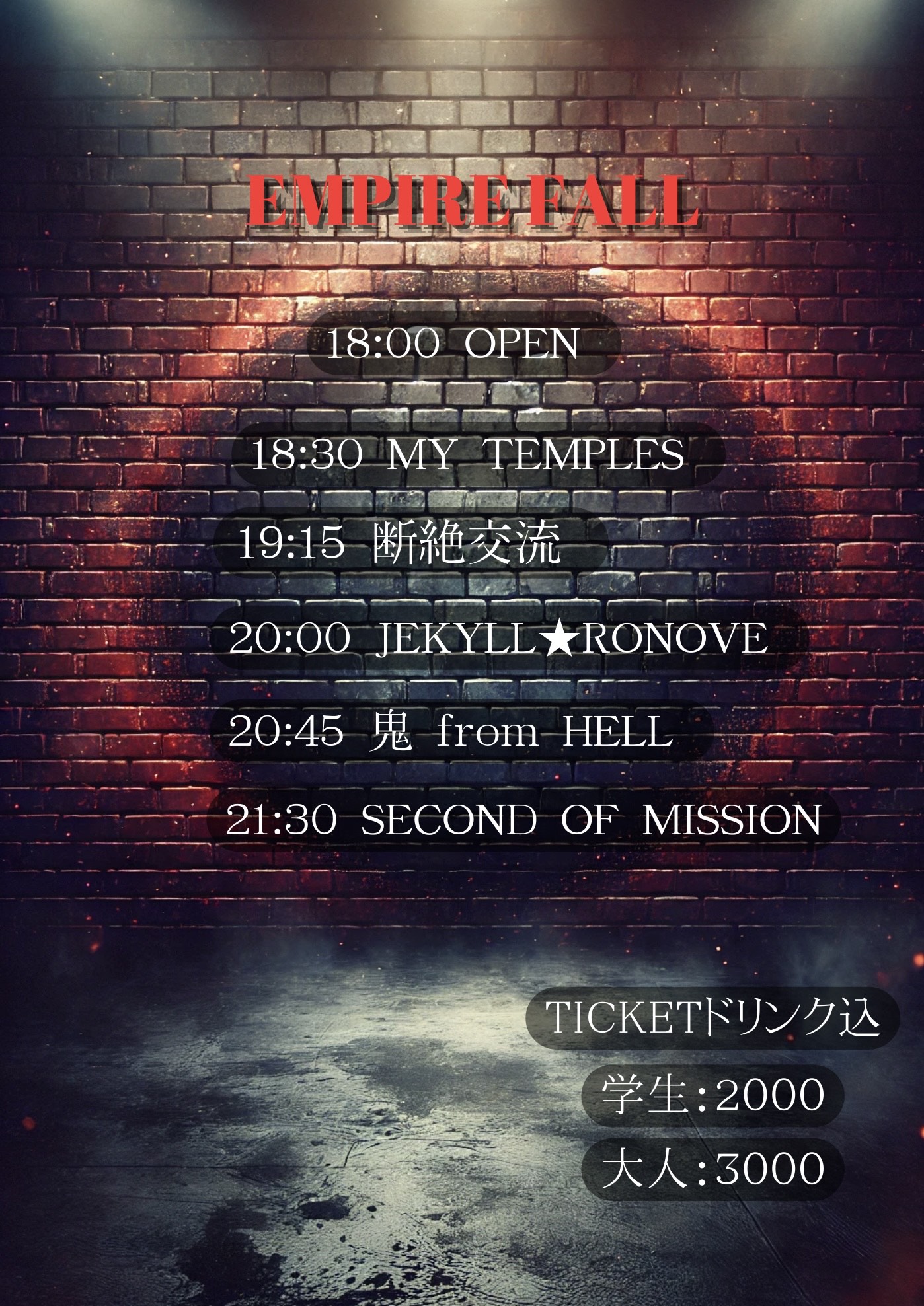 出演者 SECOND OF MISSION 鬼 from HELL 断絶交流 JEKYLL★RONOVE MY TEMPLES OPEN 18:00 / START 18:30 CHARGE ¥3,000 / 学生 ¥2,000 (1DRINK付)