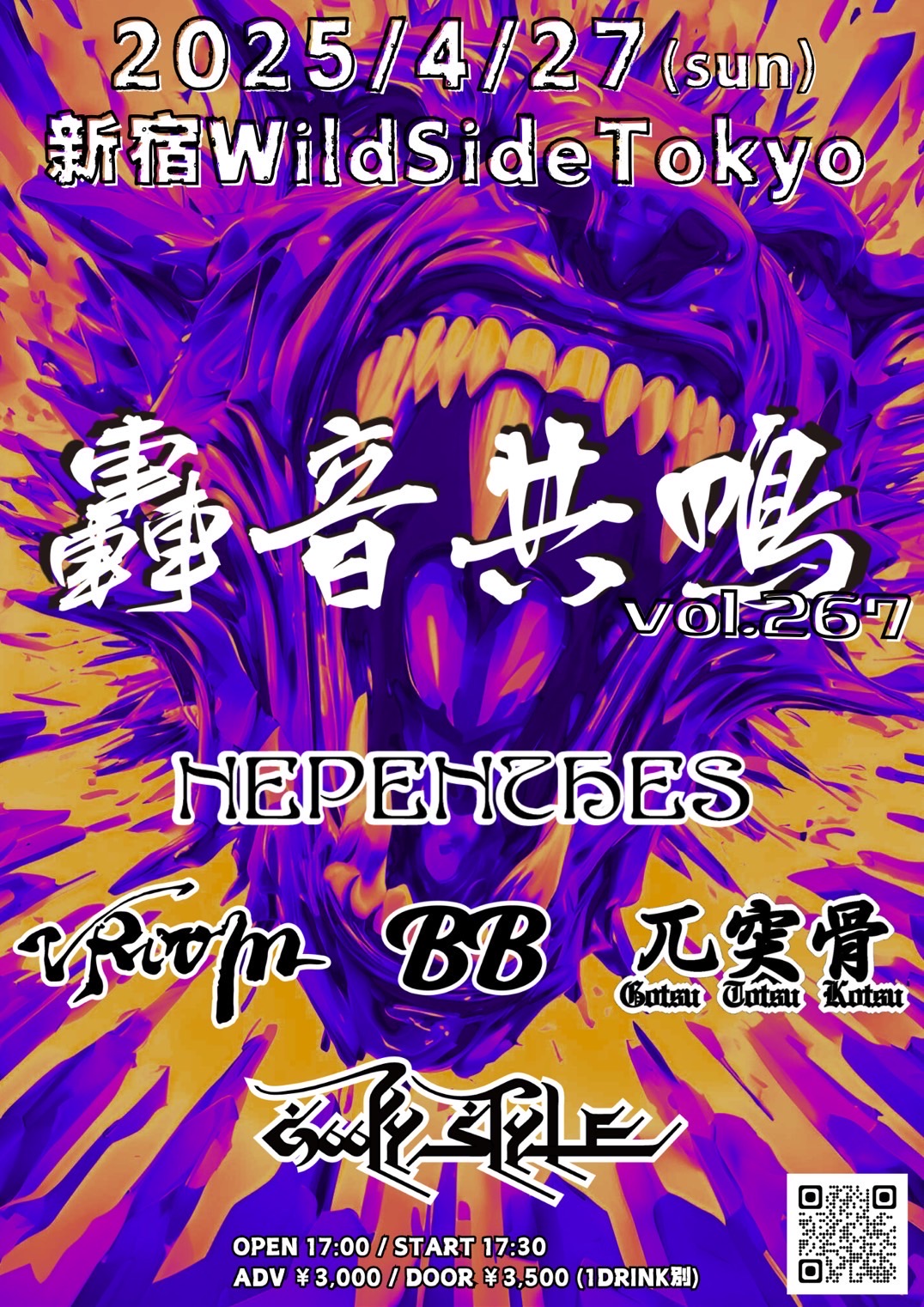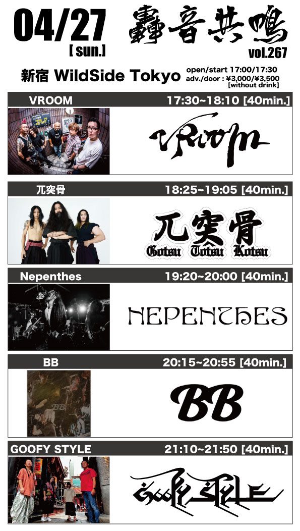 出演者 GOOFY STYLE BB Nepenthes 兀突骨 Vroom OPEN 17:00 / START 17:30 ADV ¥3,000 / DOOR ¥3,500 (1DRINK別)