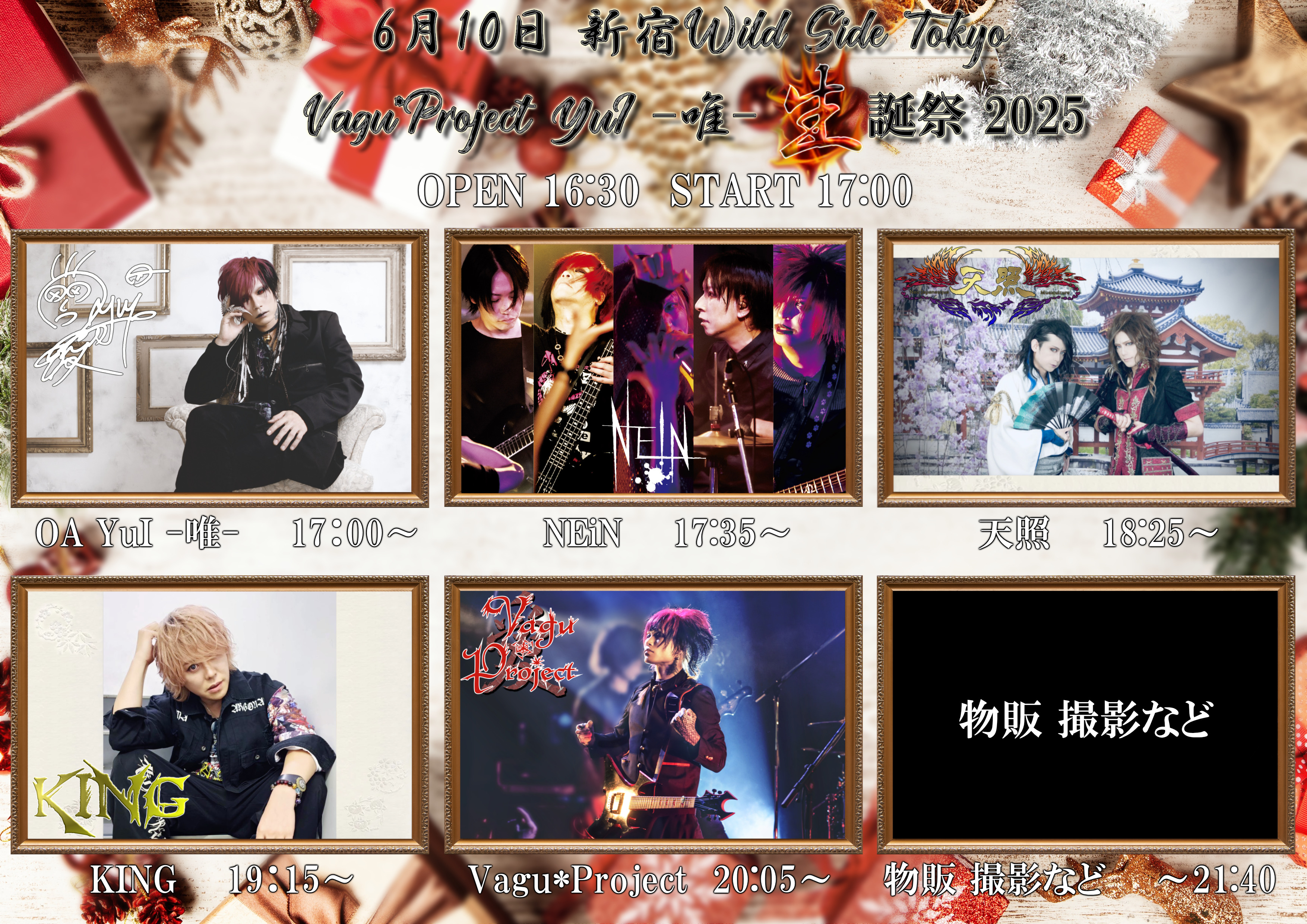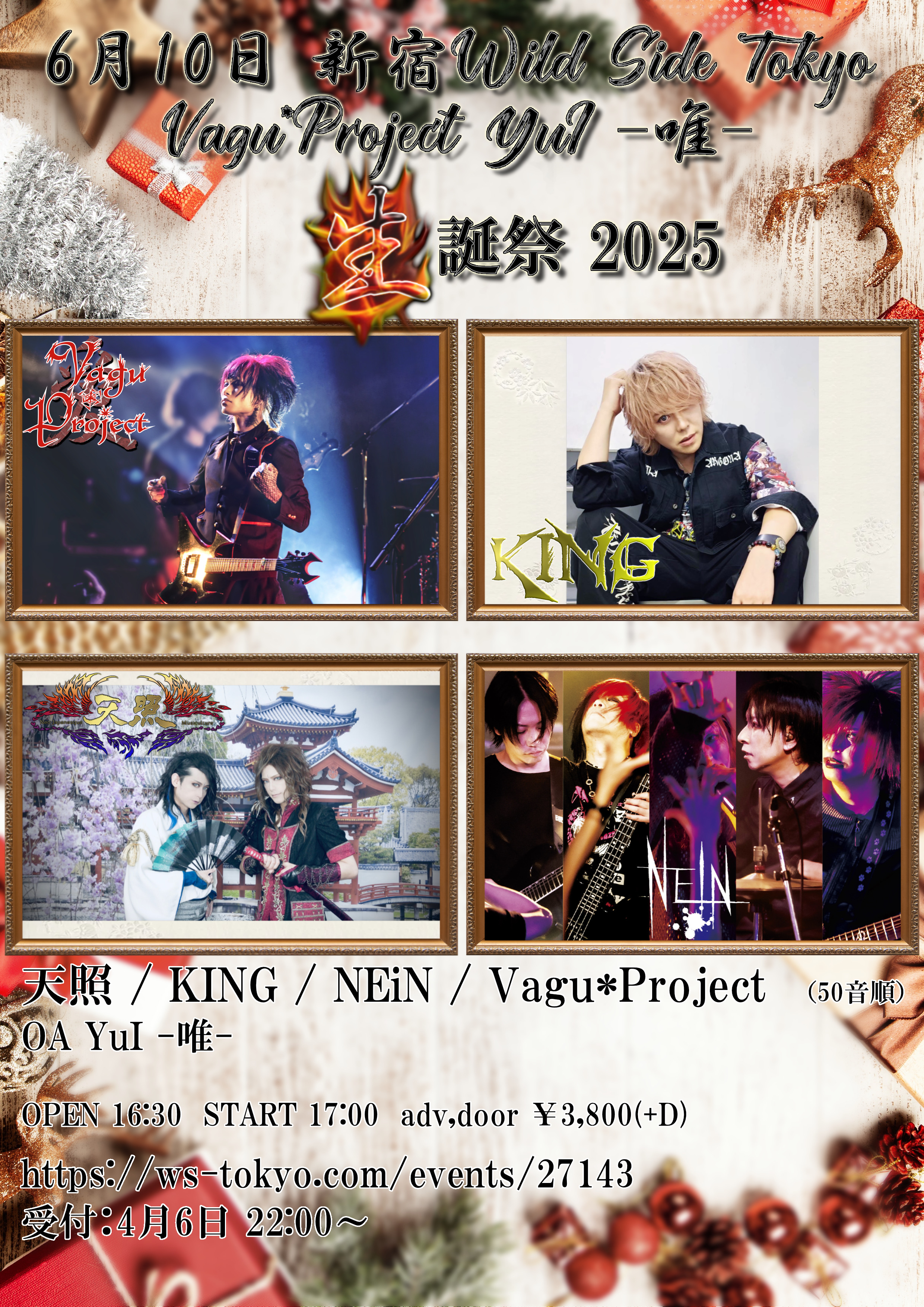 出演者 天照 KING NEiN Vagu*Project OA YuI -唯- OPEN 16:30 / START 17:00 TICKET ¥3,800 (1DRINK別)