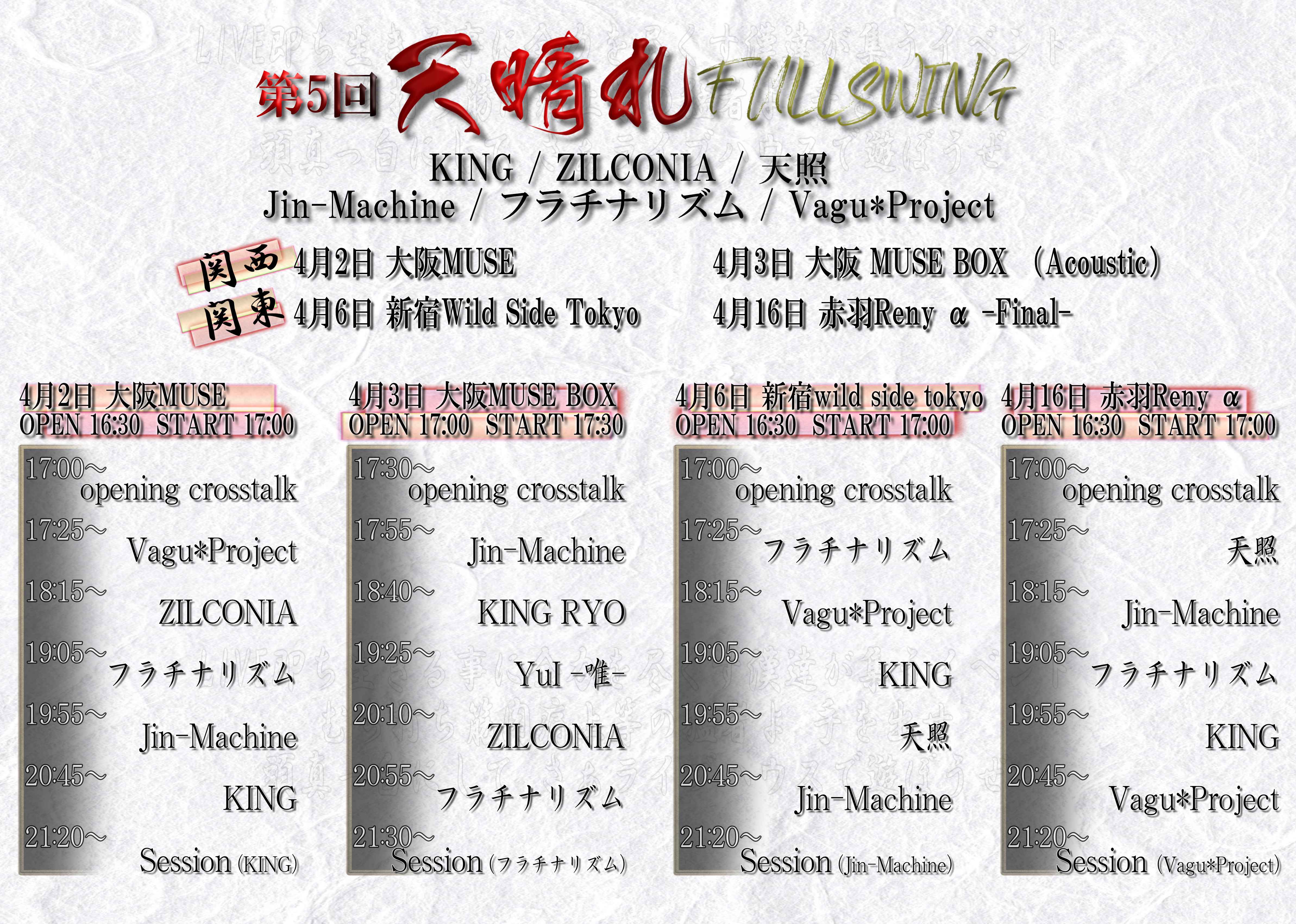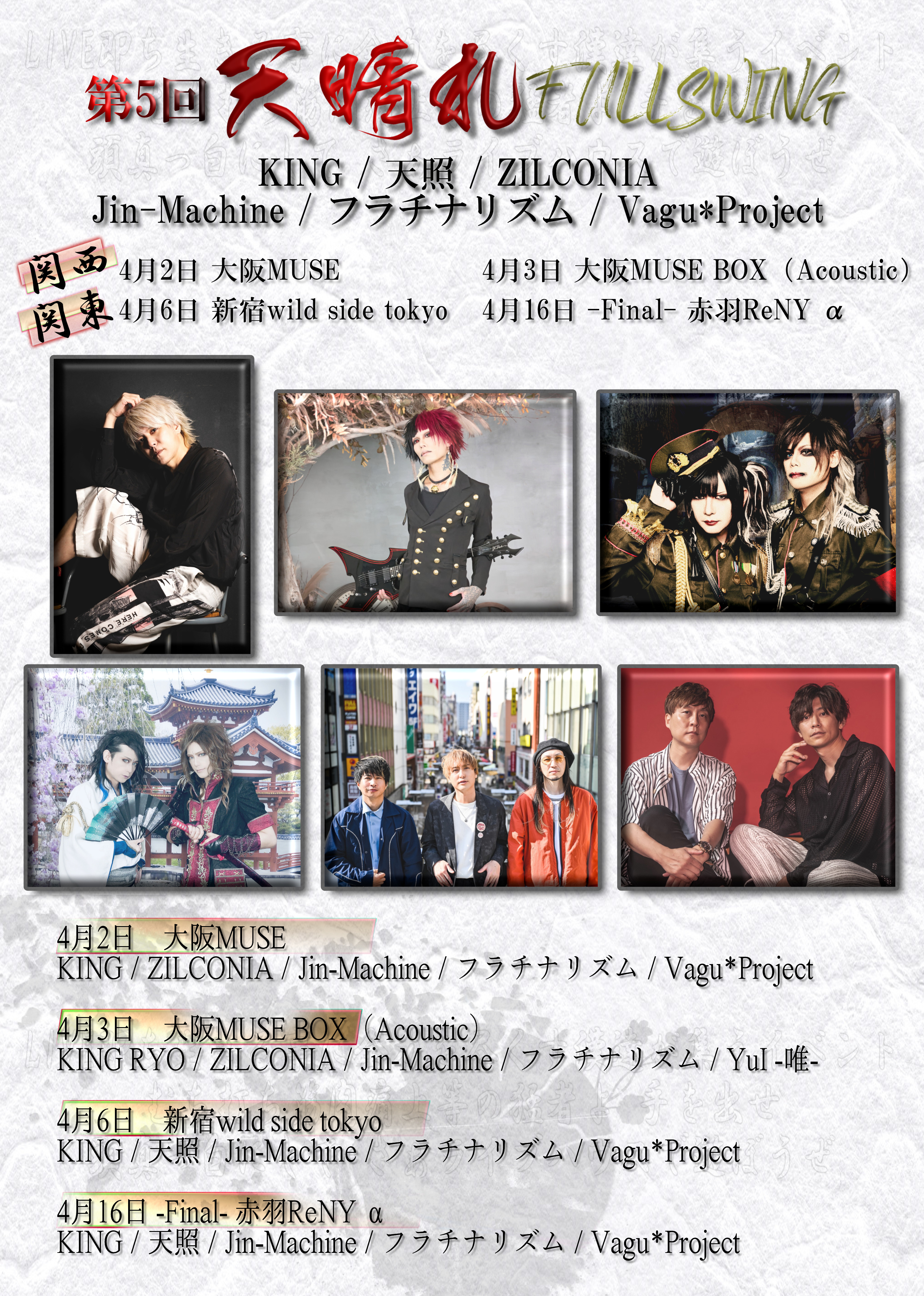 出演者 KING 天照 Jin-Machine フラチナリズム Vagu*Project OPEN 16:30 / START 17:00 ADV ¥4,000 / DOOR ¥4,500 (1DRINK別) 1ドリンク 600円 ロック / ヴィジュアル系