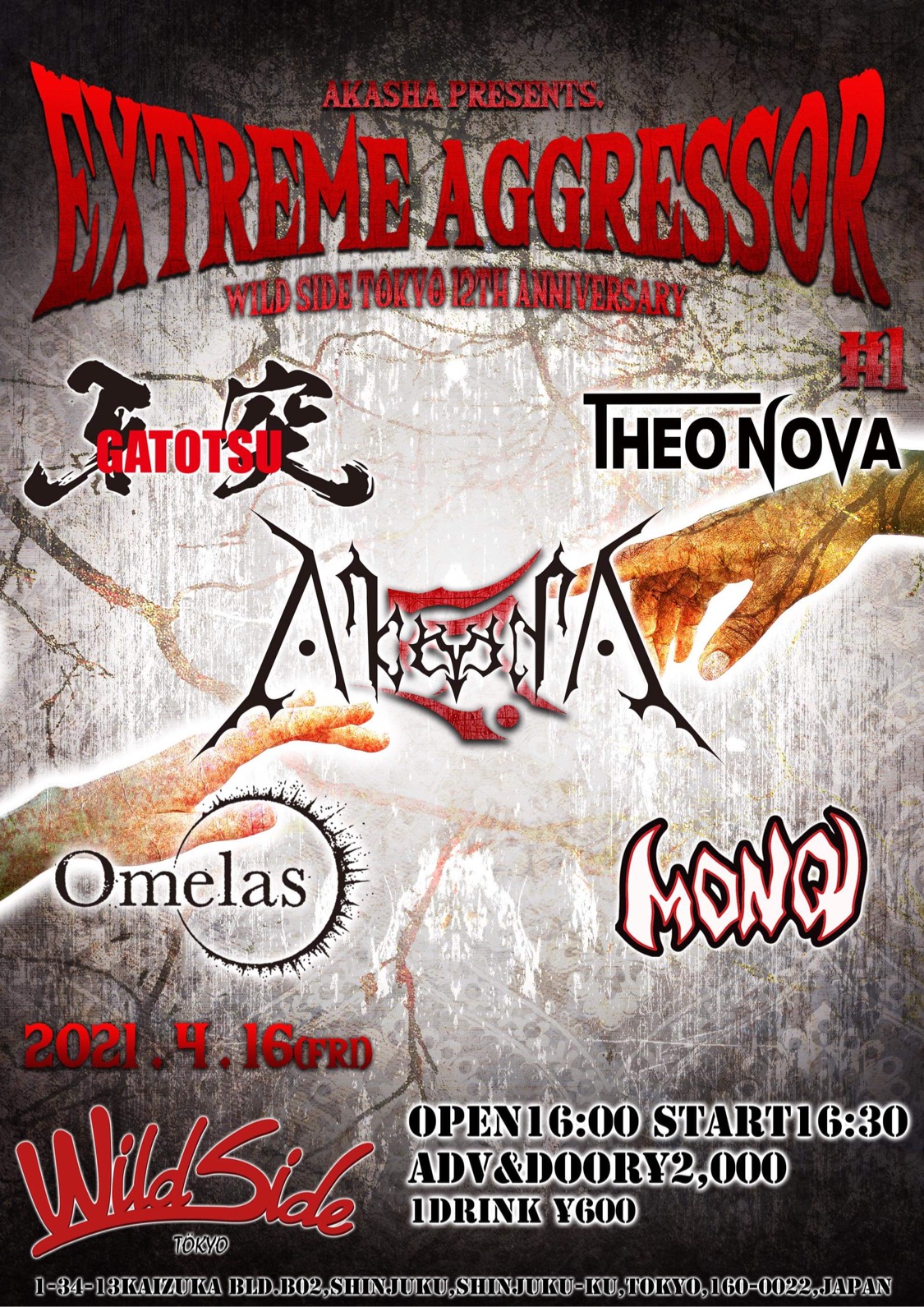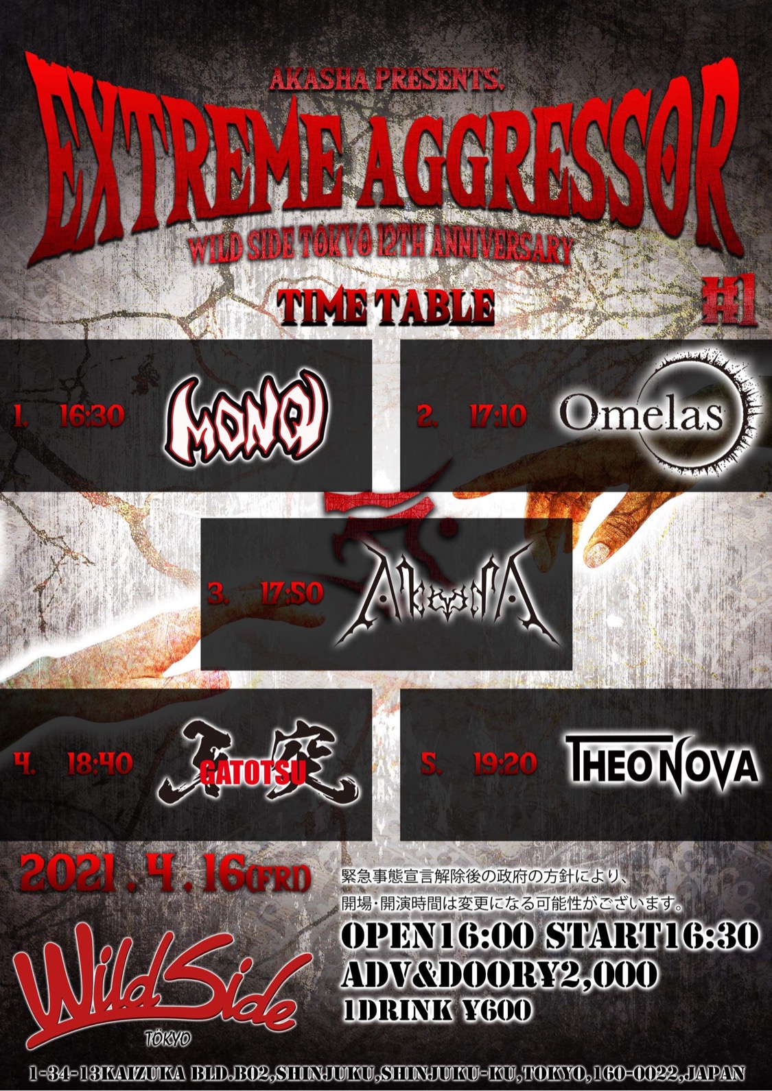 出演者 AkashA 牙突 MONQ Omelas THEO NOVA OPEN 16:00 / START 16:30 ¥2,000