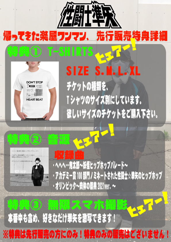 出演者 性闘士準矢 OPEN 11:30 / START 12:00 先行販売 ¥4,000(1DRINK込み、特典付き) / 予約 ¥4,000(1DRINK別、特典なし)