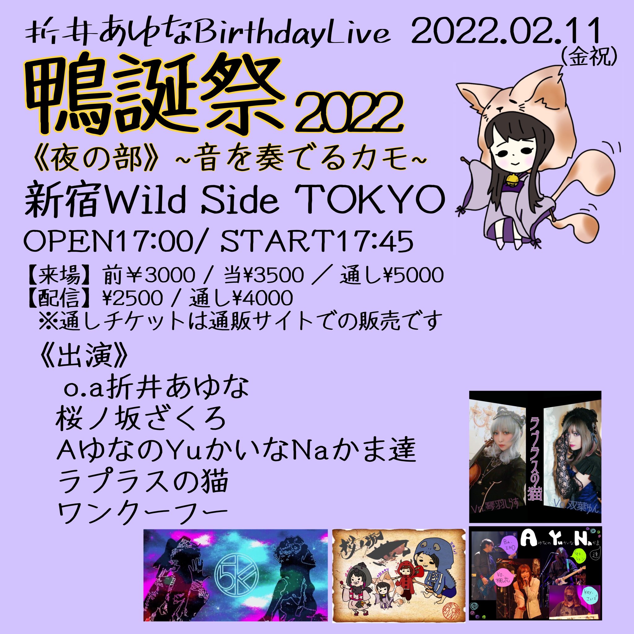 出演者 桜ノ坂ざくろ AゆなのYuかいなNaかま達 ラプラスの猫 ワンクーフー OPEN 17:45 / START 18:30 ADV ¥3,000 / DOOR ¥3,500 / 配信¥2,500