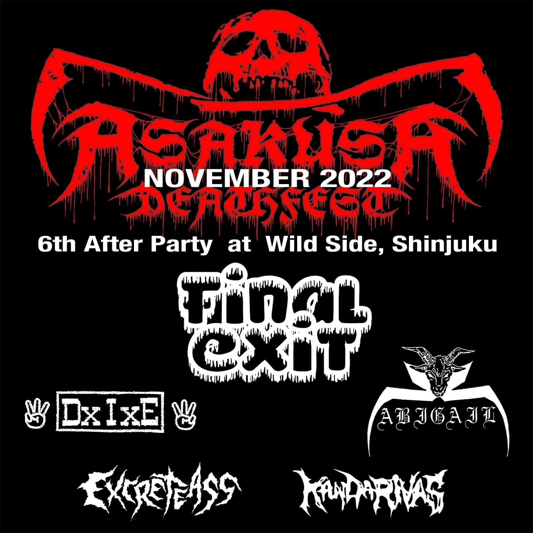 出演者 FINAL EXIT ABIGAIL DxIxE EXCRETEASS KANDARIVAS OPEN 15:00 / START 16:00 ADV ¥3,000 / DOOR ¥3,500 (+2Drink)