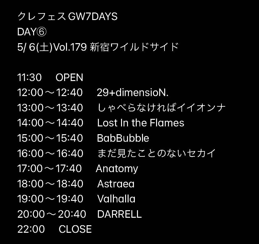 出演者 Anatomy しゃべらなければイイオンナ Lost In the Flames Valhalla DARRELL まだ見たことのないセカイ BabBubble Astraea 29+dimensioN. OPEN 11:30 / START 12:00 ADV ¥3,500 / DOOR ¥4,000 / 配信 ¥3,500