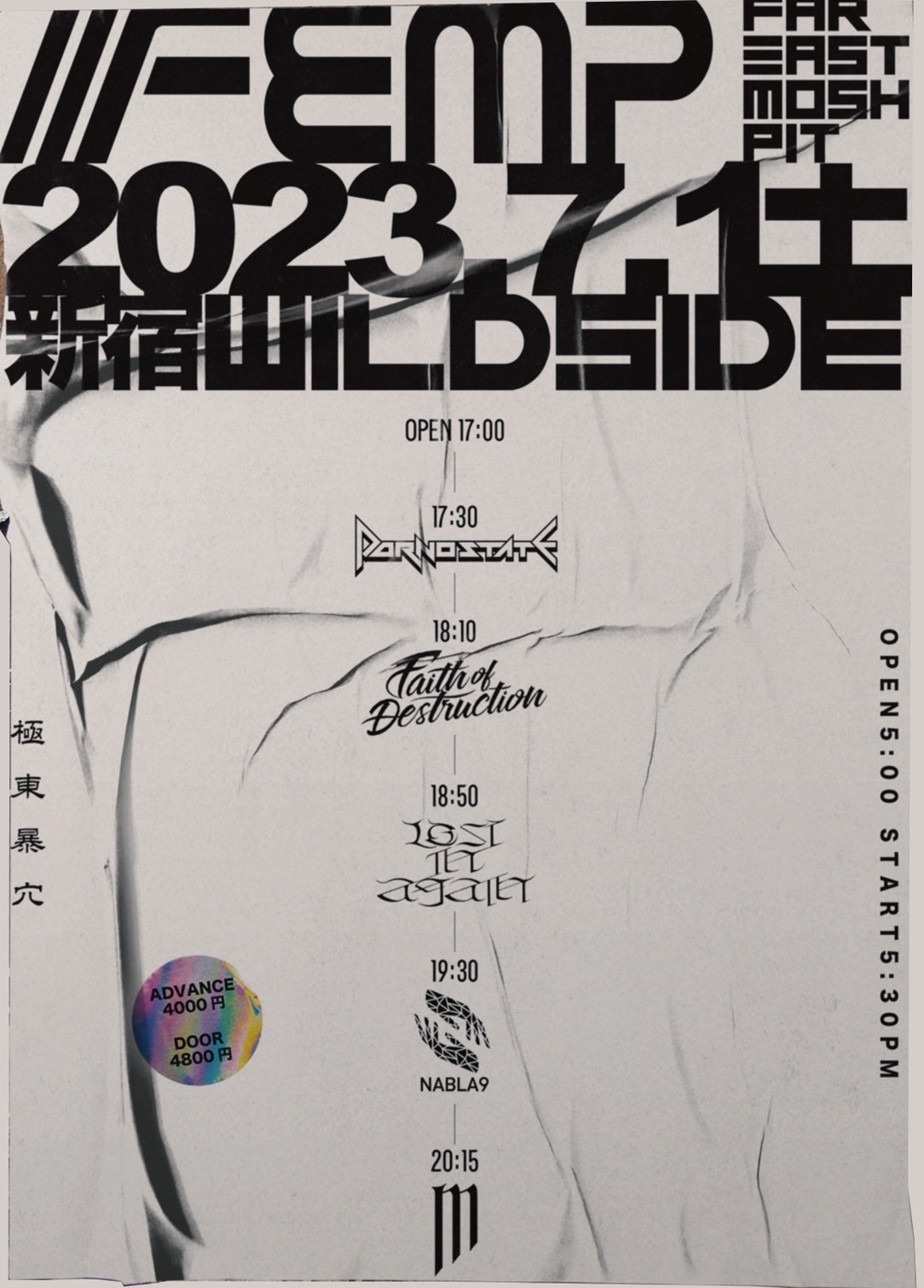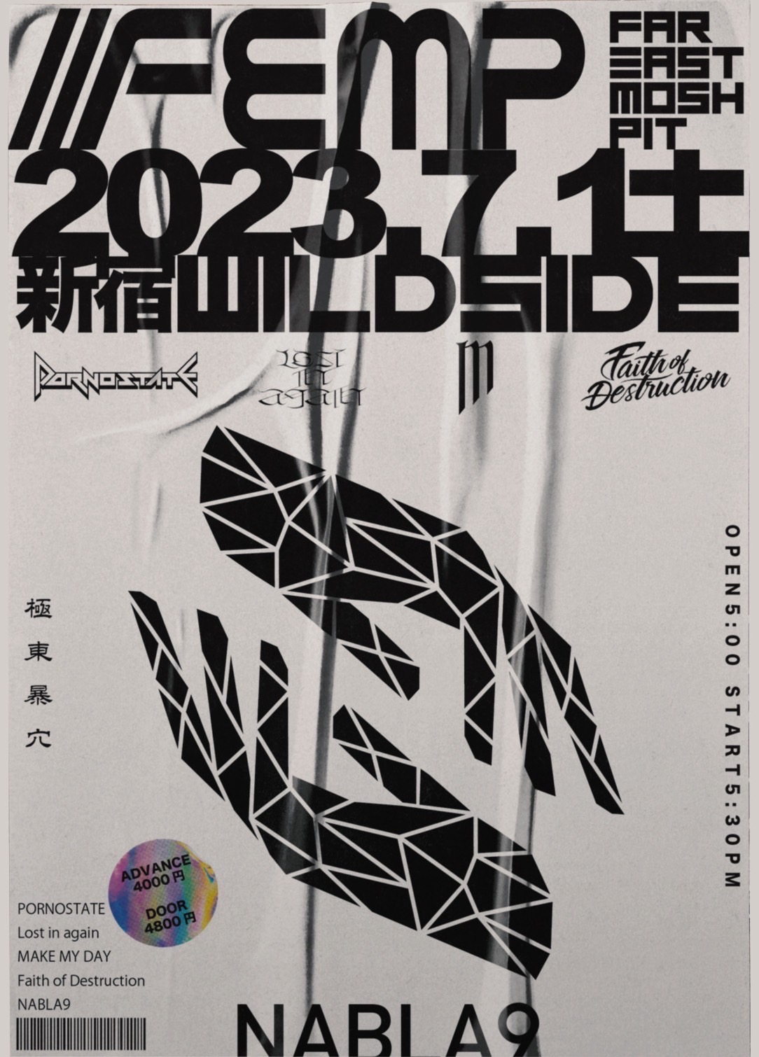 出演者 NABLA9 MAKE MY DAY Lost in again Faith of Destruction PORNOSTATE OPEN 17:00 / START 17:30 ADV ¥4,000 / DOOR ¥4,800
