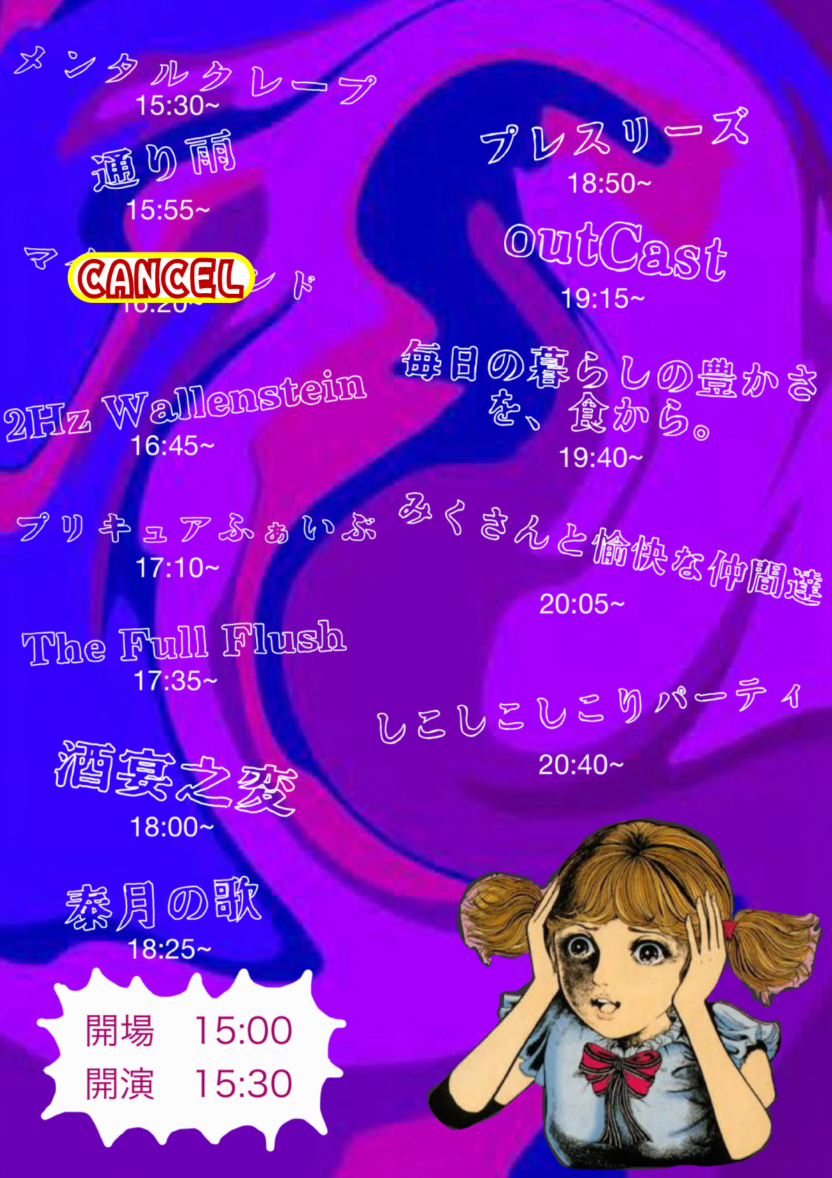 出演者 メンタルクレープ 通り雨 2 Hz Wallenstein プリキュアふぁいぶ The Full Flush 酒宴之変 泰月の歌 プレスリ ーズ outCast 毎日の暮 らしの豊かさを、食から みくさんと 愉快な仲間たち☆☆ しこしこしこりパーティ OPEN 15:00 / START 15:30 1 drink charge¥600